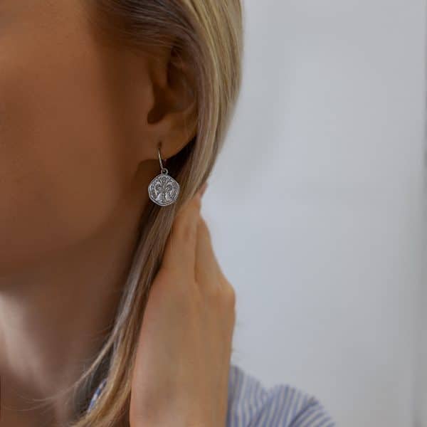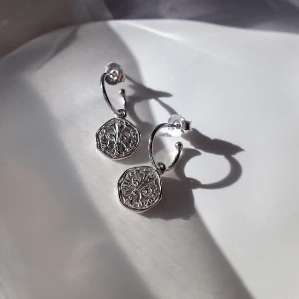 These drop earrings with a removable Florin on a half hoop perfectly combine tradition and modernity. The earrings feature a half-hoop mode of 925 sterling silver or 18Kt Gold Plated 925 sterling silver, from which two Florin pendants dangle.