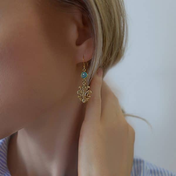 Questi orecchini sono caratterizzati da un pendente a forma di giglio fiorentino, noto anche come “Fleur-de-Lis”, uno dei simboli più iconici di Firenze, confinato con una pietra di calcedonio acqua.